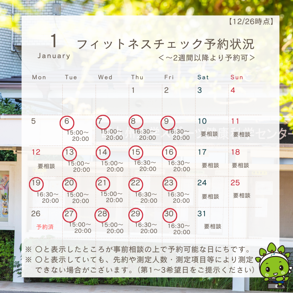 2026年1月フィットネスチェック予約状況のお知らせ 2025 12/26 2025年12月26日 2026年1月のスケジュールについてお知らせいたします。 ご利用を希望される方(団体等)はお問い合わせよりご連絡ください。 お知らせ お知らせ一覧へ