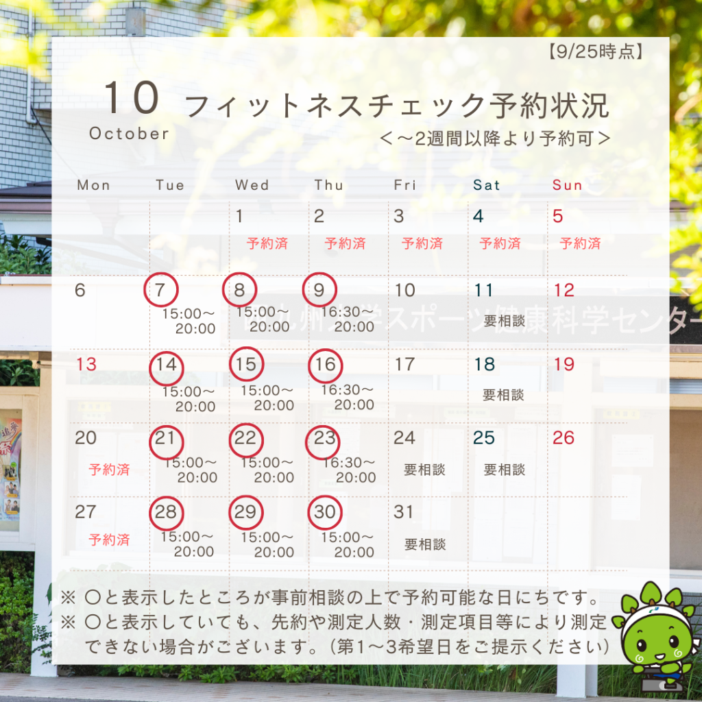 2025年10月 フィットネスチェック予約状況のお知らせ 2025 10/01 2025年10月1日 2025年10月のスケジュールについてお知らせいたします。 ご利用を希望される方(団体等)はお問い合わせよりご連絡ください。 お知らせ お知らせ一覧へ