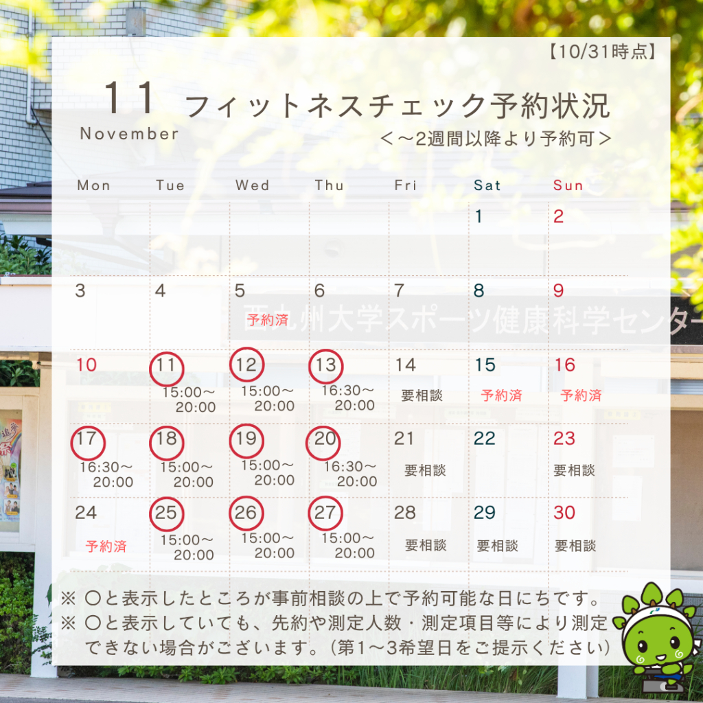 2025年11月フィットネスチェック予約状況のお知らせ 2025 11/13 2025年11月13日 2025年11月のスケジュールについてお知らせいたします。 ご利用を希望される方(団体等)はお問い合わせよりご連絡ください。 お知らせ お知らせ一覧へ